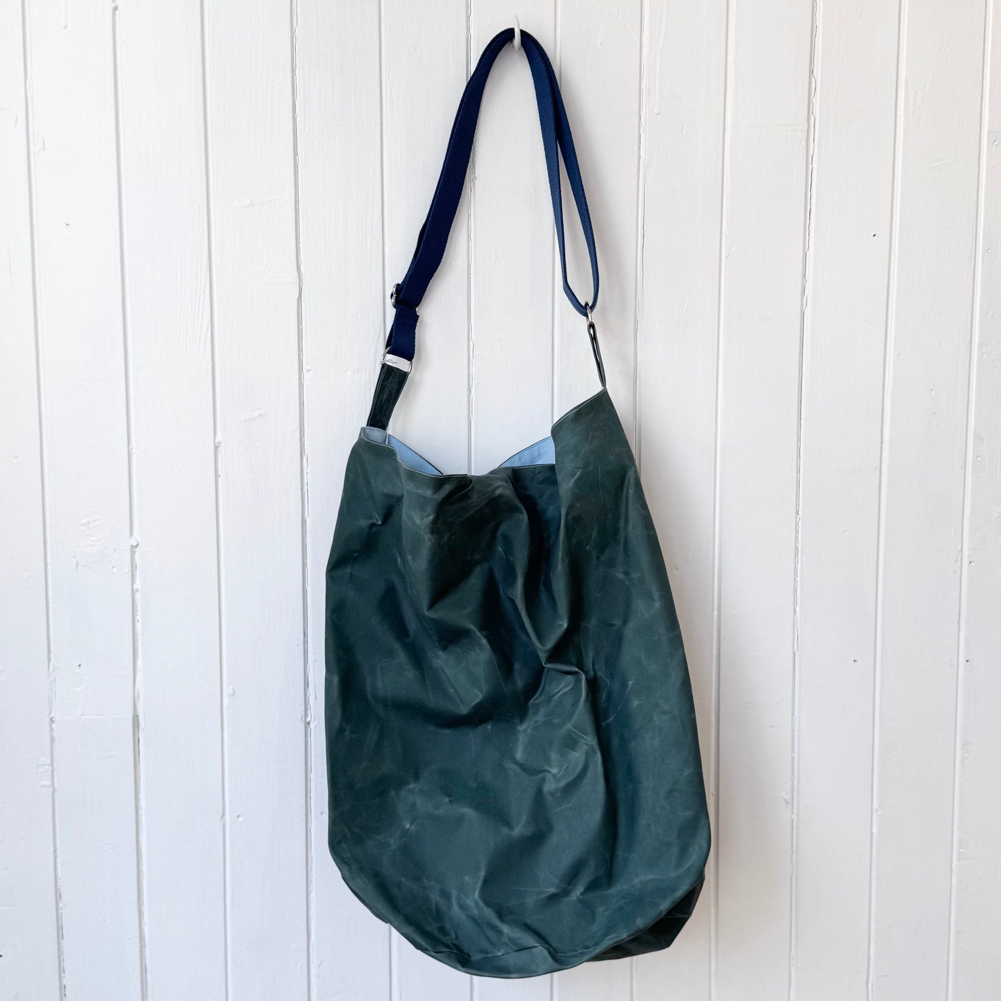 large traditional oilskin bucket bag with navy webbing adjustable strap. Pale blue lining with internal pocket