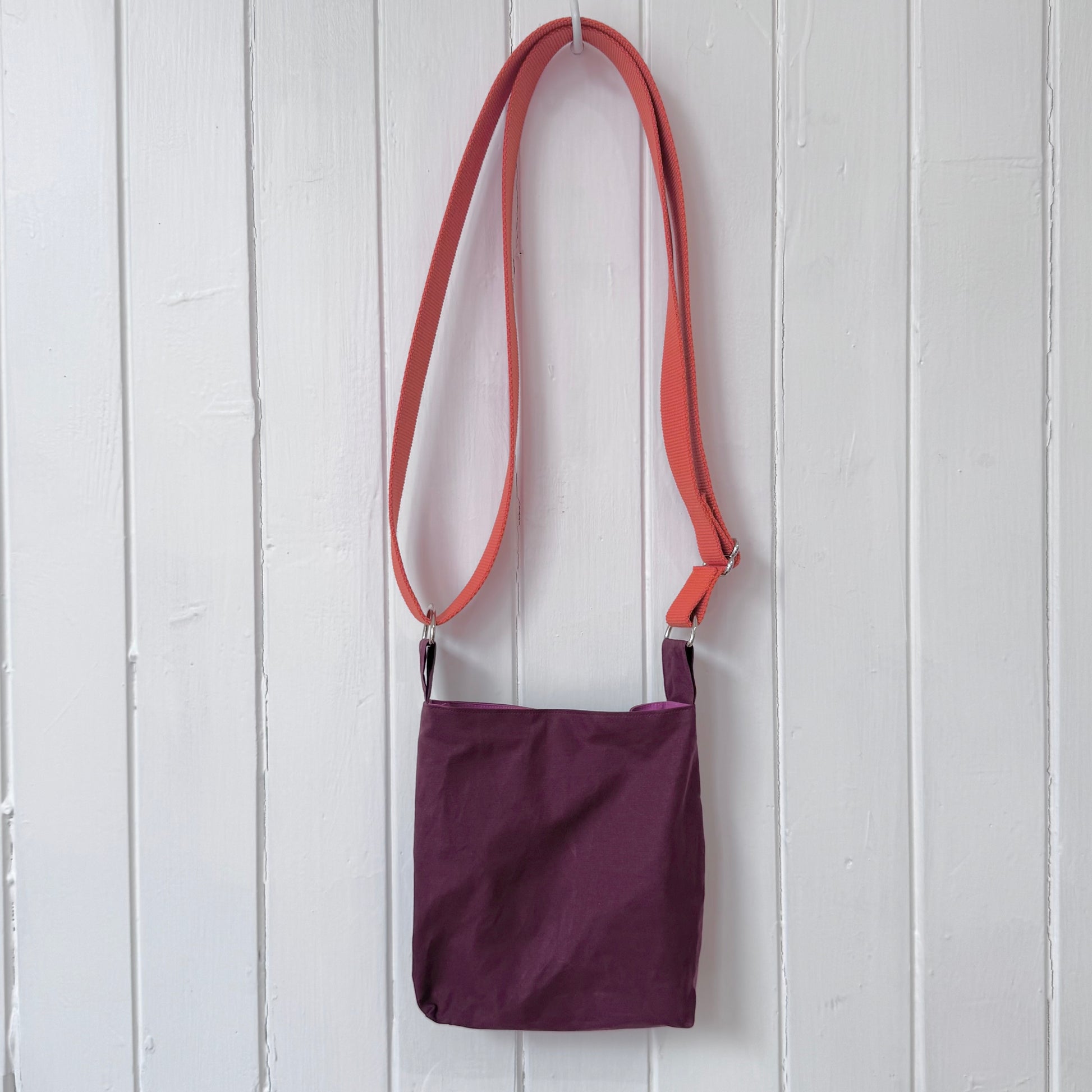 Handmade dry oilskin shoulder bag 18cm x 18cm with webbing strap with dry oilskin webbing and closed by a magnetic clasp. Adjustable strap 66cm - 108cm.